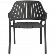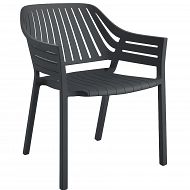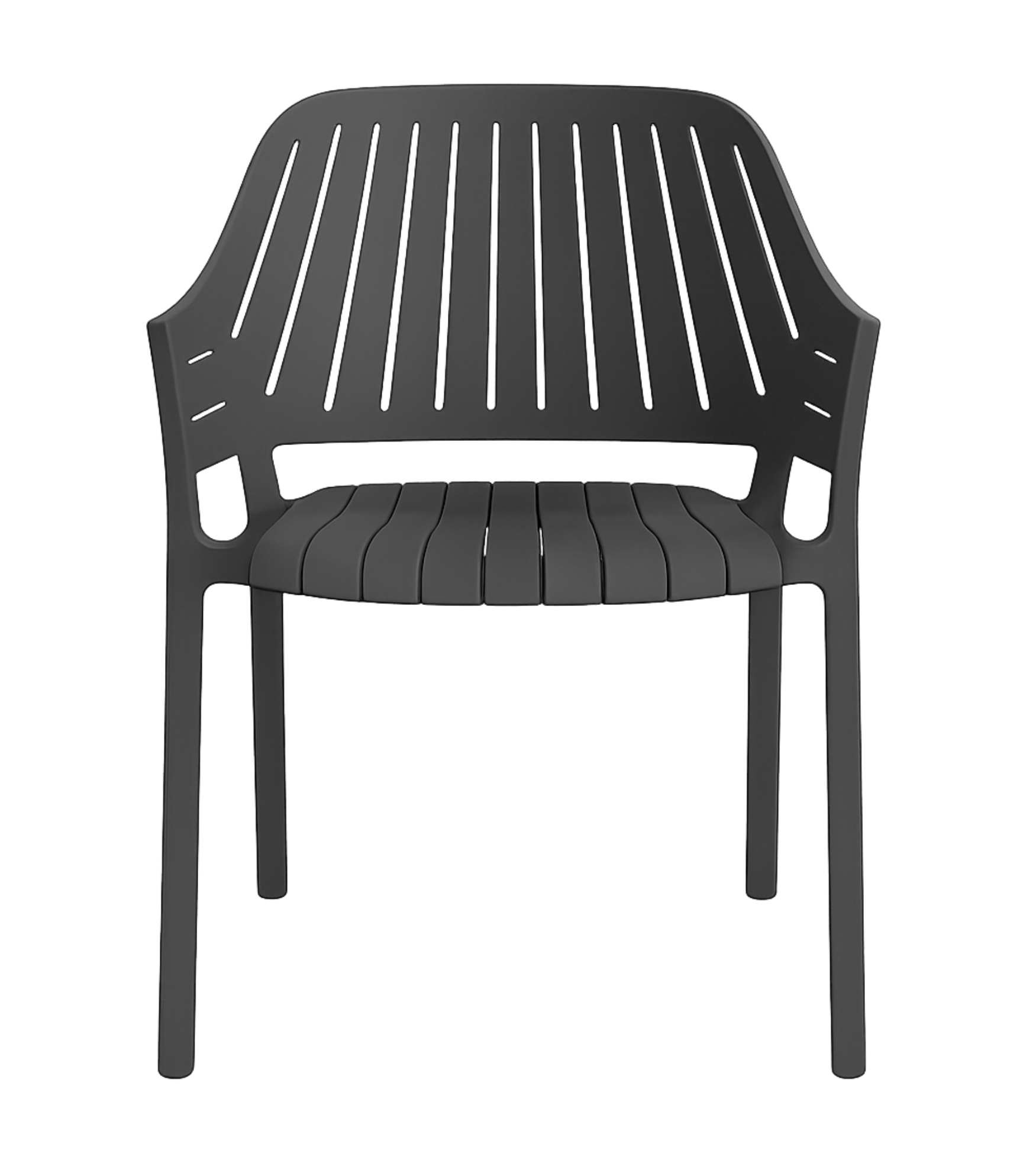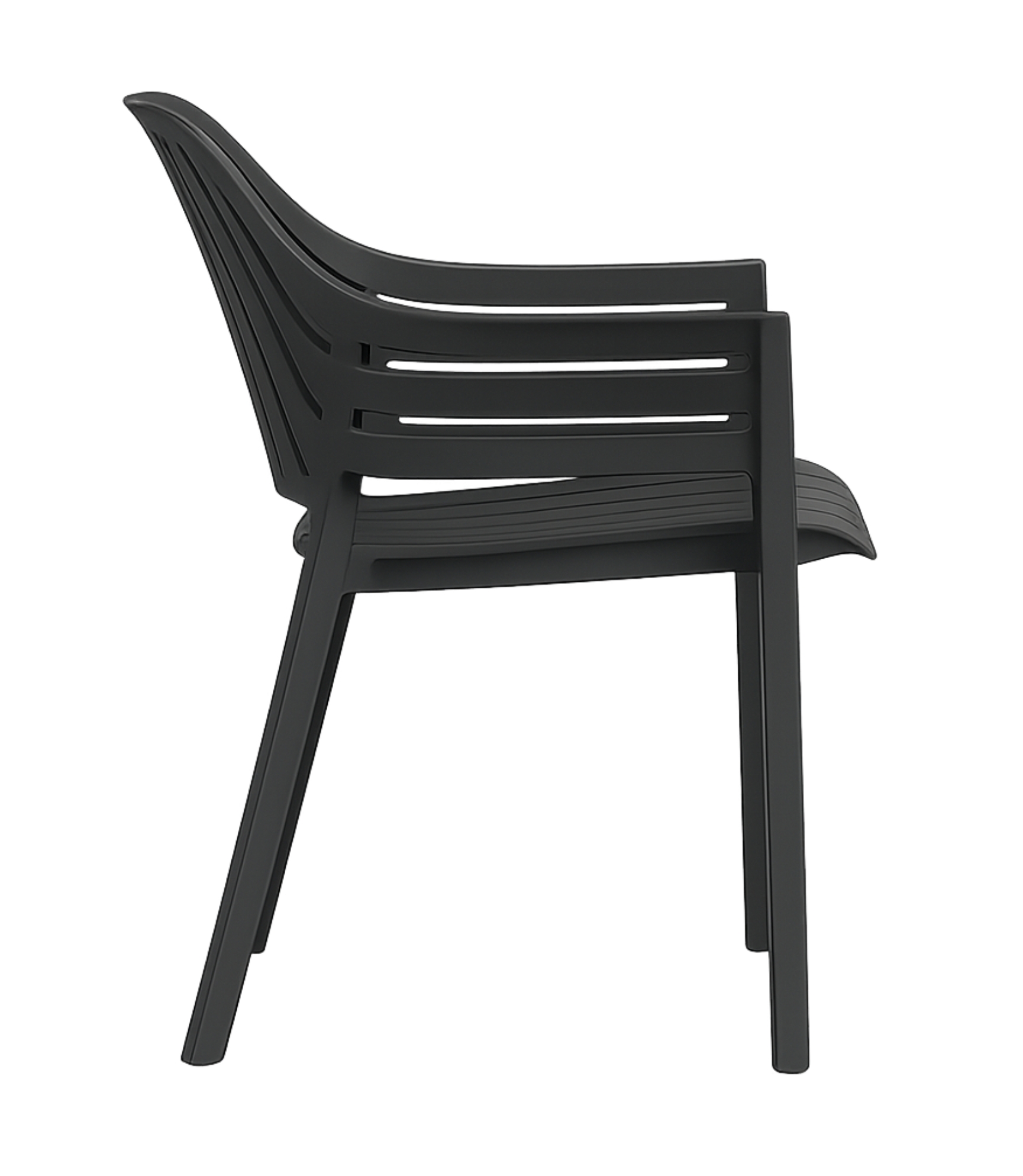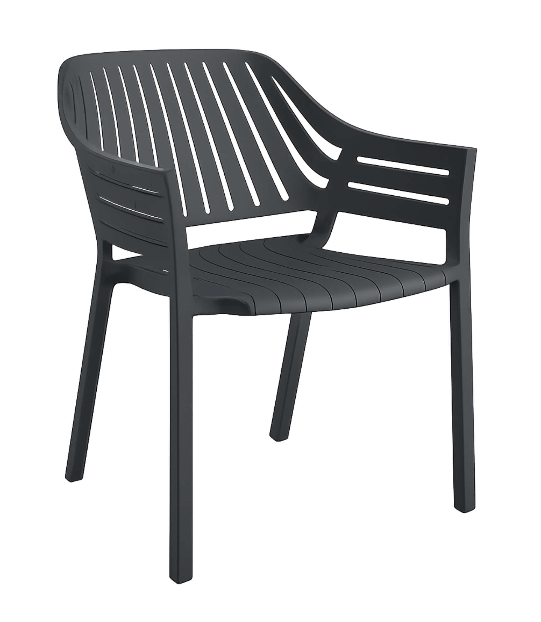 Stol RAY ANTRACIT navduši z lahkotno, sodobno obliko in udobnim sedežem z integriranimi rokonasloni. Vertikalne reže v naslonu in sedežu ustvarijo zračen videz, elegantni antracitni odtenek pa se brezčasno ujema z različnimi interierji.