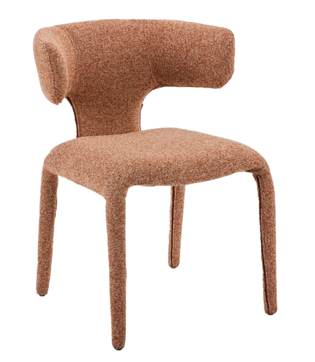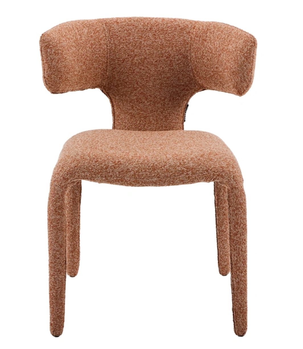Stol Keti Terracotta izstopa s sodobnim videzom in udobnim sedenjem. Sedišče in naslon sta oblazinjena v mehko rdeče-bakreno tkanino, ki prostoru doda toplino in značaj. Noge, oblečene v blago, ustvarjajo prefinjen, usklajen videz. Kompaktne dimenzije stola ga naredijo idealnega za jedilnice, dnevne sobe ali sodobne pisarne.